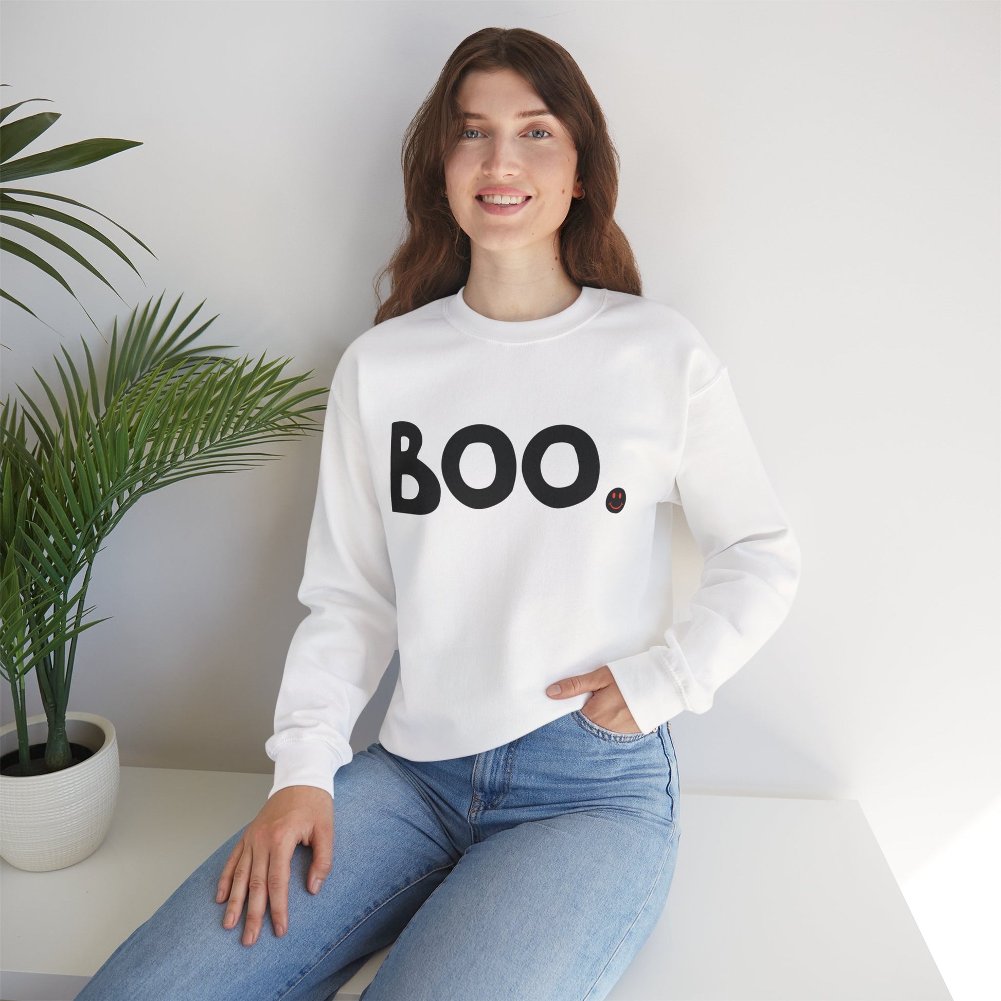Hey! Ohh! Jumpscare. Express "What Makes You Happy" and embrace cozy comfort with this Heavy Blend™ crewneck sweatshirt, designed to deliver warmth and style during the chillier months. Featuring a playful 'BOO' design, this sweatshirt is perfect for adding a fun, spirited vibe to your fall wardrobe. Ideal for Halloween celebrations, cozy family gatherings, or simply lounging at home, it fits seamlessly into any casual setting.